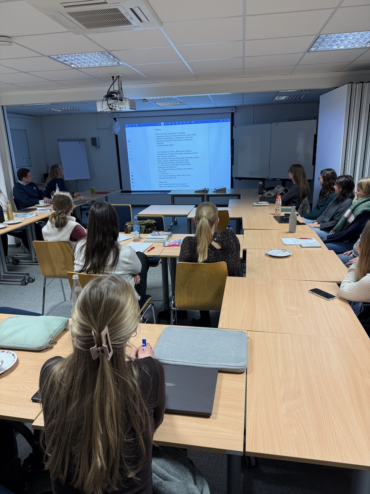 In seminarübergreifenden Gruppen arbeiteten die Referendarinnen und Referendare anschließend mit Lehrwerken für die Mittelstufe (3. Lernjahr) und die Oberstufe für Neueinsteiger. Dabei entstanden tareas finales, also Lernaufgaben, komplette Sequenzplanungen sowie die erste Stunde der jeweiligen Sequenz.